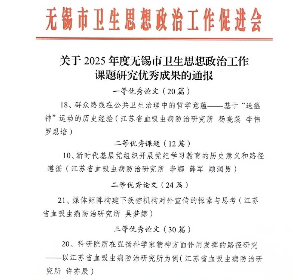 沉甸甸的荣誉背后,是我所对思政工作与行业实际深度融合的不懈追求,更是我所思政工作高质量发展的生动缩影。未来我所将持续深化思政工作与血防科研、公卫服务深度融合,以高质量成果赋能卫生健康事业高质量发展。
