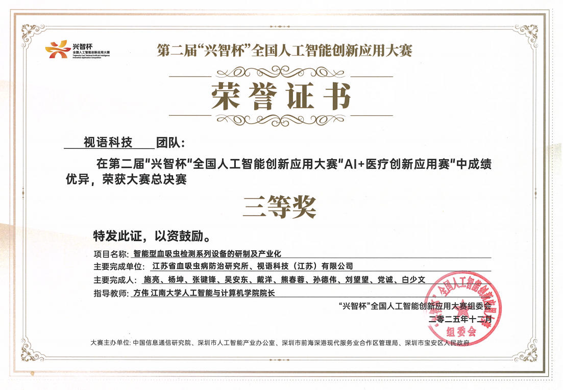 近日,由我所牵头组建的视语科技团队项目——“智能型血吸虫检测系列设备的研制及产业化”,历经书面评审、两轮现场答辩的严苛筛选,凭借创新性应用成果与扎实的实践成效,成功斩获第二届“兴智杯”全国人工智能创新应用大赛“AI+医疗赛道”二等奖及总决赛三等奖。