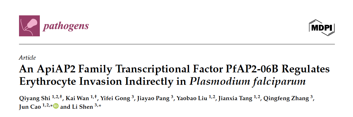 近日,我所疟疾团队在《Pathogens》期刊上发表了题为《An ApiAP2 Family Transcriptional Factor PfAP2-06B Regulates Erythrocyte Invasion Indirectly in Plasmodium falciparum》的研究文章。研究发现,转录因子PfAP2-06B的在调控疟原虫入侵宿主红细胞过程中发挥关键作用,PfAP2-06B 转录因子在寄生虫的红细胞入侵过程中起到了间接调控作用,这一发现为理解疟疾的发病机制提供了新的见解。