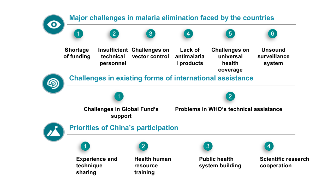 访谈结果提示,目前疟疾流行国面临的主要挑战包括资金缺乏、技术人力资源不足、病媒控制挑战、抗疟产品短缺、全民健康覆盖(UHC)挑战、疟疾监测系统不完善等。疟疾流行国家对与中国合作持积极态度,在抗疟技术和经验分享、卫生人力资源培训、公共卫生体系建设和科研合作方面有较大需求。