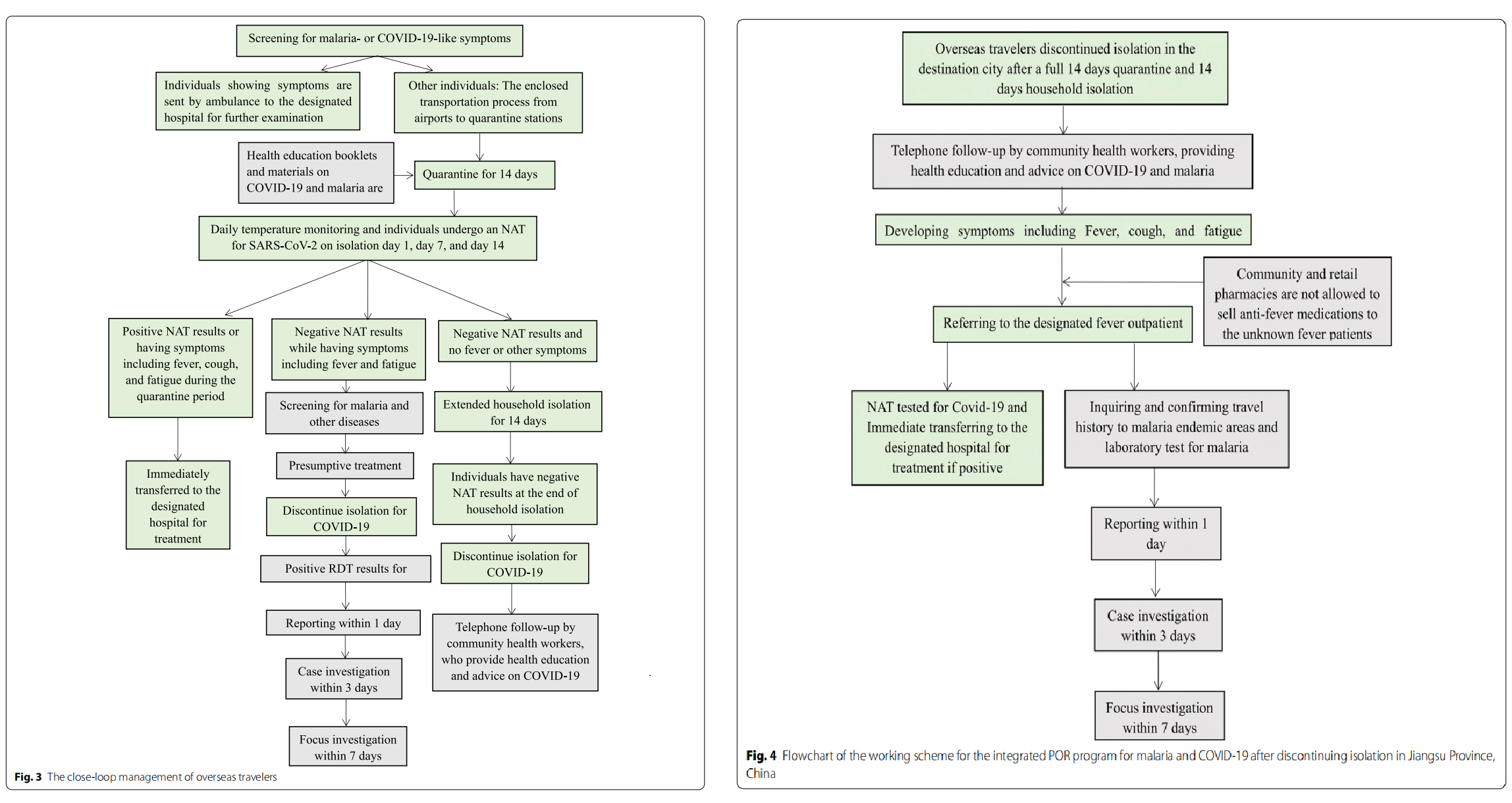 我国于2021年6月30日获得世卫组织的国家消除疟疾认证。但是,目前全球仍有近90个国家有疟疾流行,每年2亿多人感染,因此境外输入疟疾引起再传播的风险持续存在。在新冠肺炎疫情的影响下,很多传染病的防控都受到影响,因此,如何在开展新冠疫情“外防输入”的同时可持续的开展输入性疟疾的防控,是亟待思考和解决的问题。本研究基于扬州市疾控机构开展输入性疟疾健康管理工作的全流程,探究在新冠疫情下,境外回国人员在入境前、机场、闭环管理过程中、隔离点(隔离酒店)及隔离后(社区健康管理)等一系列输入性新冠肺炎防控过程中,如何有效且可持续的开展输入性疟疾的早期监测和健康管理,特别是探讨了将输入性新冠与输入性疟疾防控进行融合的工作模式方案及实施过程中遇到的困难,并提取了解决方案。本研究通过知情人访谈和焦点座谈的方法,探讨新冠疫情影响下输入性疟疾防控的难点和挑战,设计了将输入性新冠肺炎防控和输入性疟疾防控相融合的“外防输入”工作模式和流程(如图所示),为制定疟疾消除后可持续的输入性疟疾防控方案提供了科学参考。