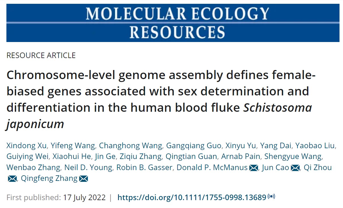 近日,江苏省血防研究所与合作者在国际生物进化领域顶级期刊《Molecular Ecology Resources》上在线发表了题为“Chromosome-level genome assembly defines female-biased genes associated with sex determination and differentiation in the human blood fluke Schistosoma japonicum”的研究性论著。该论文通过组装高质量的染色体级别的日本血吸虫全基因组,鉴定了ZW性染色体,揭示了日本血吸虫性染色体的演化模式以及雌性性别决定与分化的相关基因。