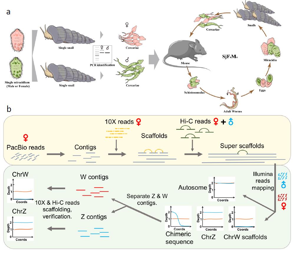 血吸虫病是严重影响人类健康的重大寄生虫病,血吸虫在进化上所属的裂体科是扁形动物门中唯一一类雌雄异体的类群。而且,虽然血吸虫是ZW型性别决定,但其性染色体的分离和建立并没有赋予雌虫独立完成性发育和成熟的全部能力。在由童虫向成虫发育的过程中,血吸虫具有独特的雌雄虫合抱现象。雌虫只有在合抱雄虫的持续刺激下,生殖系统才能发育成熟,并源源不断的产卵。而虫卵是血吸虫的主要致病因素,也是血吸虫病传播的主要阶段。因此,血吸虫性别决定和分化是血吸虫发育成熟和致病的关键环节。但由于缺乏高质量的染色体级别的基因组数据,使得日本血吸虫ZW性染色体的分离和鉴定成为一大难题,因此其性染色体的演化以及性别决定与分化的遗传学基础尚不清楚。