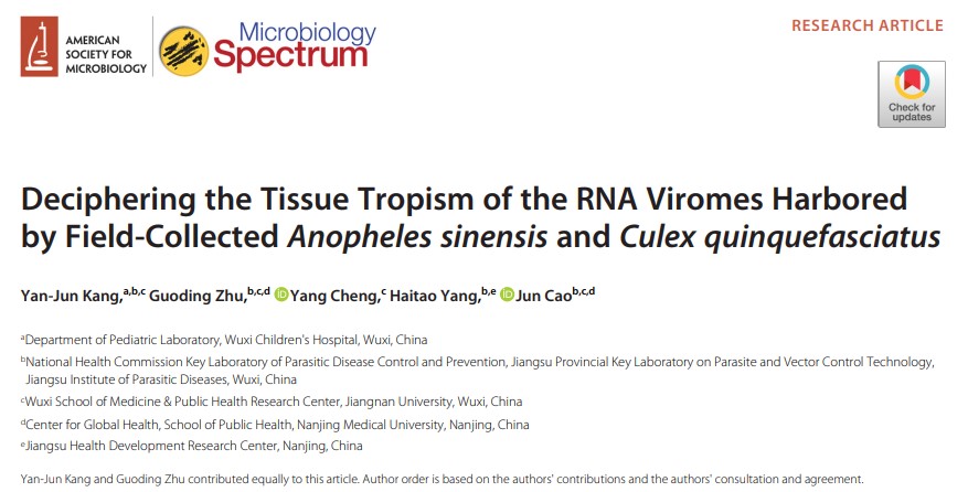 近日,江苏省血防研究所的科研人员在美国微生物学会旗下新兴学术期刊《Microbiology spectrum》(IF: 9.043)在线发表了题为Deciphering the Tissue Tropism of the RNA Viromes Harbored by Field-Collected Anopheles sinensis and Culex quinquefasciatus 的研究性论著。该论文基于二代测序技术和转录组学研究手段,首次解析了中华按蚊和致倦库蚊这两种蚊种体内的ISV组织极性,为蚊媒病毒的相关研究带来了新的视角。