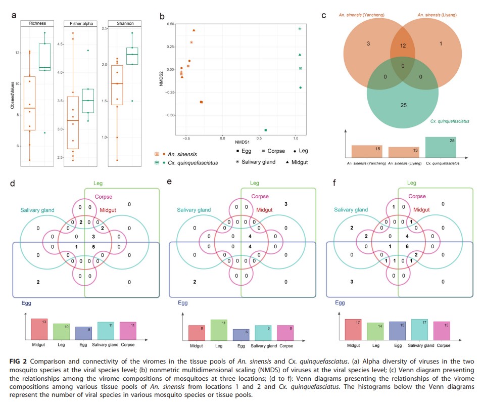 本研究为还原自然状态下蚊虫体内病毒组的真实状况,确立了捕获野外饱血蚊虫,实验室培养后解剖组织进而测序和解析的研究策略。研究团队先后赴江苏省盐城、溧阳和宜兴等地采集吸血蚊虫,对鉴定后确定的中华按蚊和致倦库蚊的唾液腺、中肠、蚊腿等不同组织的测序共发现了40种病毒基因组相关序列,其中有19种是本研究首次报道,分布于十多个不同病毒分类单位中。两个蚊种中携带的病毒组组分差异极大,同一蚊种不同组织的病毒特征亦呈现不同特征。结果显示检测到的ISV表现出了不同的组织极性,并且呈现出一定的规律。蚊卵携带的病毒组从丰度到多样性均与其他组织有较大差异,同时唾液腺和腿中的病毒组丰度最高。部分中华按蚊中的病毒在不同地区中的组织极性的差异,提示此类病毒在传播方式上的多样性,尤其是强调了环境对病毒传播的重要影响。相较于其他基于高通量测序技术的病毒组研究,本研究进一步将蚊虫携带ISV图谱精细化,为蚊虫携带病毒的进化特征及传播规律的研究提供了新的视角。