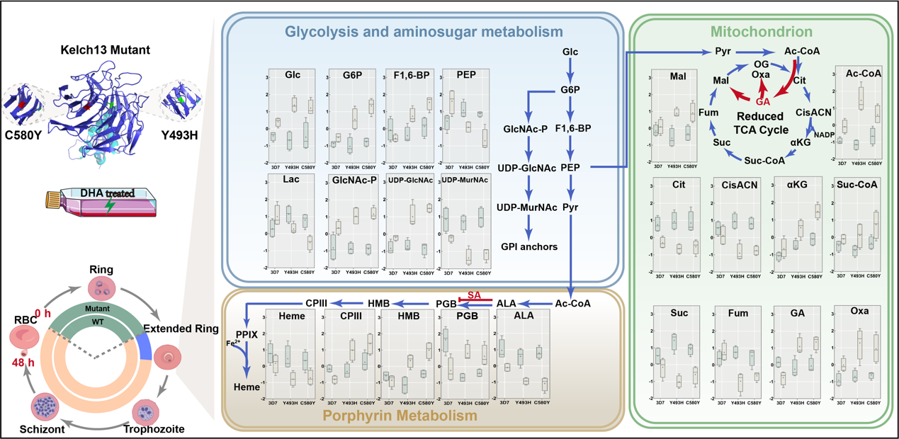 在该文章中,研究者首先利用CRISPR/Cas9技术对恶性疟原虫Kelch13蛋白的C580Y和Y493H位点进行突变;通过环状体存活实验(RSA),明确突变虫株通过滞育改变生活史的方式产生青蒿素耐受表型。进一步利用感染红细胞和未感染红细胞膜表面胆固醇含量的差异,结合胆固醇依赖性溶解细胞毒素,实现恶性疟原虫早期环状体感染红细胞的富集。在此基础之上,研究者通过比较青蒿素作用前后疟原虫代谢谱的改变,结合生物信息学分析方法,明确差异代谢物主要富集于与疟原虫能量代谢以及卟啉代谢密切相关的三羧酸循环、糖酵解和丙酮酸代谢通路;并通过代谢流改变以及化学抑制的方式,定量分析血红蛋白降解产物、青蒿素激活所导致的氧化应激压力,阐明恶性疟原虫通过滞育,减少青蒿素对其杀伤作用的表观代谢机制。