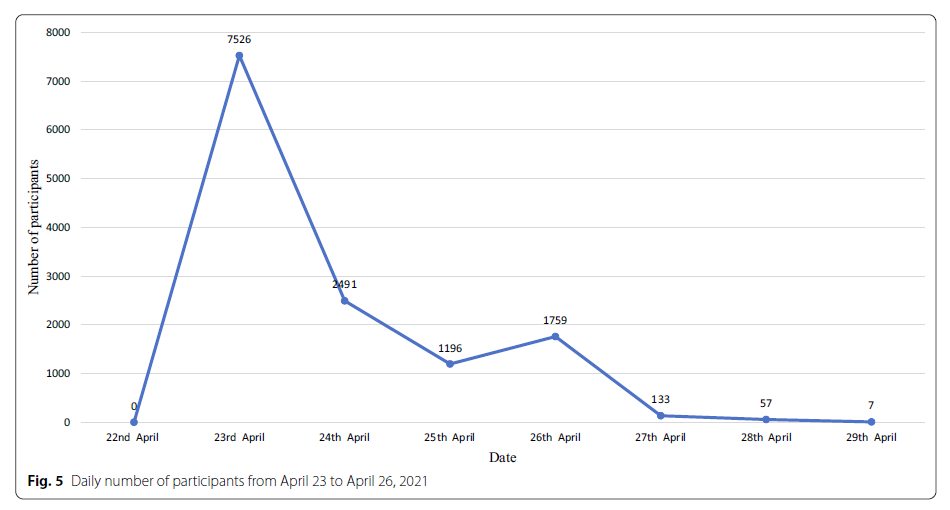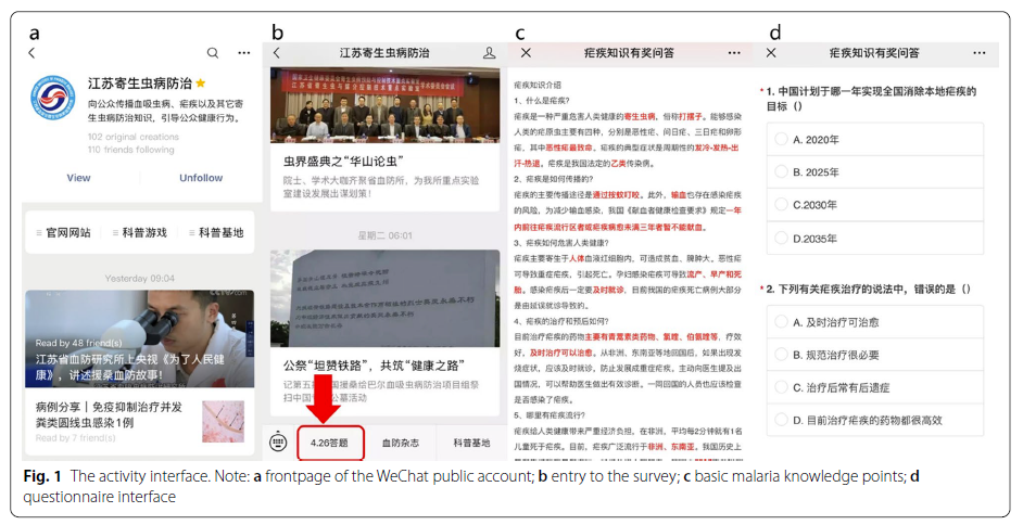 本研究通过使用在线调查工具“问卷星”构建了调查问卷。在2021年全国疟疾日期间,向关注江苏省寄生虫病防治研究所微信公众号的用户发送问卷调查,并向能在规定时间内回答问卷的个人发送微信红包。活动期间,共收集有效问卷13,169份。参与者关注与自己有关的信息(例如感染,症状和流行区域)的准确率最高(超过90%)。问卷是通过智能手机提交的,其中大部分是在 2021 年 4 月 23 日至 4 月 26 日提供微信红包的 4 天内完成的。答复的准确性与调查问卷开头显示的粗体字以及粗体字的位置和知识点数量有关。在活动持续的4天内,微信公众号的用户数量从5961人增加到12339人。因此,微信公众号是向公众传播疟疾相关卫生信息的便捷工具。发放奖励(红包)可以有效提高公众对科普健康信息和活动的关注度。