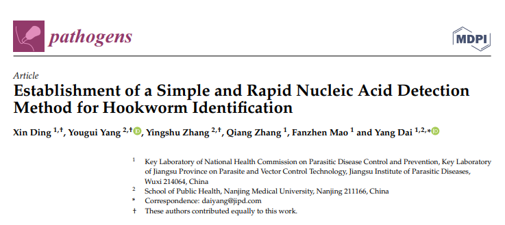 江苏省血吸虫病防治研究所丁昕主管医师和南京医科大学公卫学院硕士研究生杨友桂和张莹舒为本文共同第一作者,戴洋副研究员为本文通讯作者。该文发表于Pathogens(IF=4.531),原文链接: