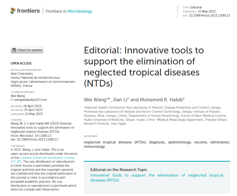 被忽视的热带病(neglected tropical diseases,NTDs)是一组主要在热带地区流行的20种寄生虫病、病毒病、细菌性疾病、真菌性疾病及非传染性疾病构成,影响全球超过10亿人口,且主要发生在卫生和医疗资源有限的贫困地区。目前,NTDs防控主要依赖化疗,但化疗覆盖率及潜在抗药性等因素制约了全球NTDs消除进程,全球消除NTDs依然面临重重挑战。2021年1月,WHO发布《结束忽视,实现可持续发展目标:2021—2030年被忽视的热带病路线图》,并提出了雄心勃勃的目标和创新方法,以在2030年前预防、控制、消除和消灭NTDs。新型创新方法将为理解NTDs发病机制提供新思路,而新技术可望为NTDs诊疗提供新选择。为展示可用于全球消除NTDs的创新工具、推动这些工具在疾病流行国家转化应用,湖北医药学院李健教授、埃及西奥多比尔哈兹研究所Mohamed R. Habib博士、江苏省血吸虫病防治研究所汪伟副研究员在Frontiers in Microbiology组稿了专辑《Innovative Tools to Support the Elimination of Neglected Tropical Diseases (NTDs)》。该专辑累计发表了13篇论文,覆盖了NTDs生物学、免疫学、流行病学、诊断和疫苗。2023年5月,三位客座编辑联名在Frontiers in Microbiology发表了评述《Editorial: Innovative Tools to Support the Elimination of Neglected Tropical Diseases (NTDs)》,对该专辑的目的、意义及载文进行了描述。江苏省血吸虫病防治研究所汪伟副研究员为该文第一作者兼通讯作者。原文链接:https://www.frontiersin.org/articles/10.3389/fmicb.2023.1208113/full。