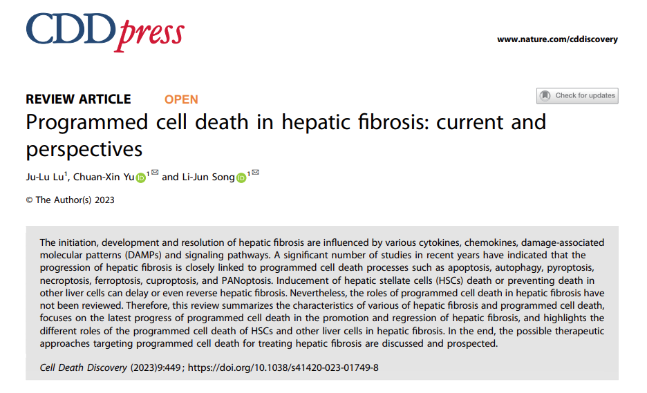 近日,余传信科研创新团队就程序性细胞死亡在肝纤维化发生发展和转归过程中的作用在《Cell Death Discovery》(IF=7.0/Q2)上发表题为“Programmed cell death in hepatic fibrosis: current and perspectives”的综述,以期为肝纤维化的治疗提供参考。