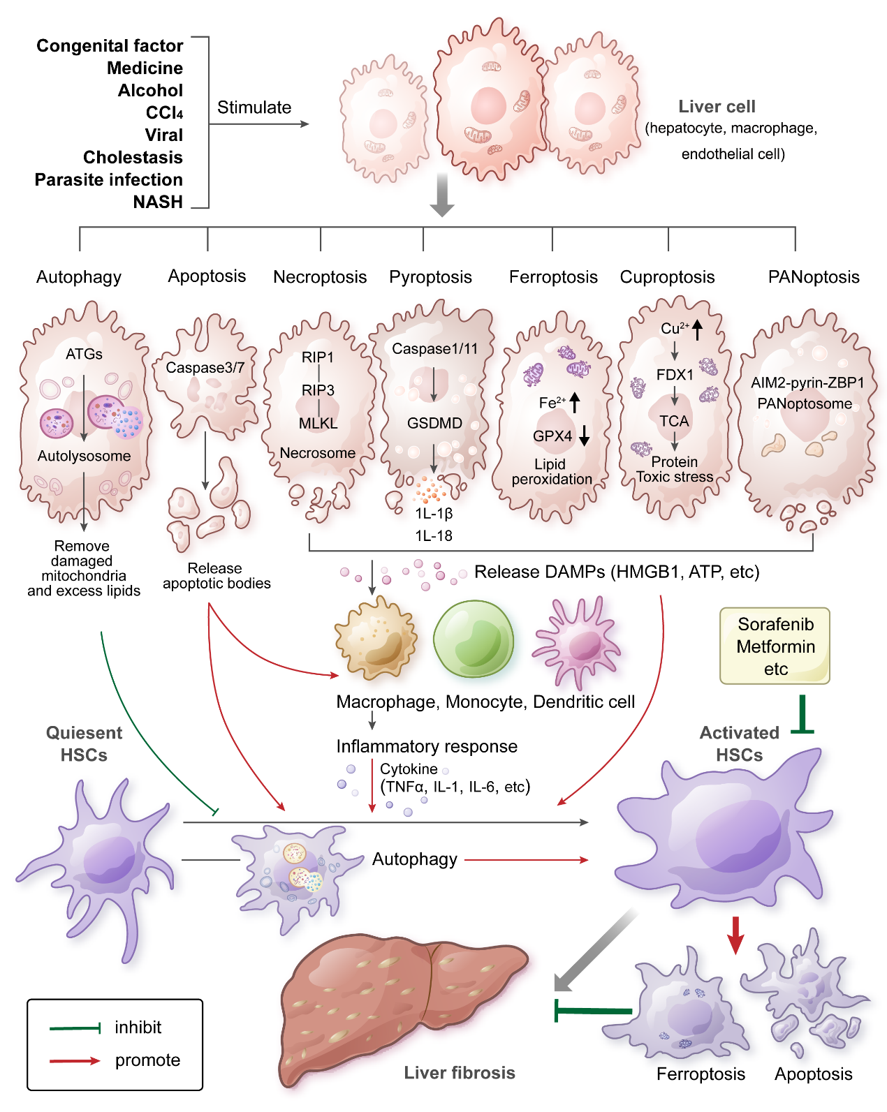 肝纤维化是各种慢性肝病发展为肝硬化和肝癌必经的病理过程。肝纤维化的发生、发展和转归受多种细胞因子、趋化因子、损伤分子模式(DAMPs)及信号通路的调控。近年来,大量研究表明细胞程序性死亡,包括细胞凋亡、细胞自噬、细胞焦亡、细胞坏死性凋亡、铁死亡和铜死亡与肝纤维化的发生发展密切相关,通过诱导或者抑制相关细胞死亡可以延缓甚至逆转肝纤维化。