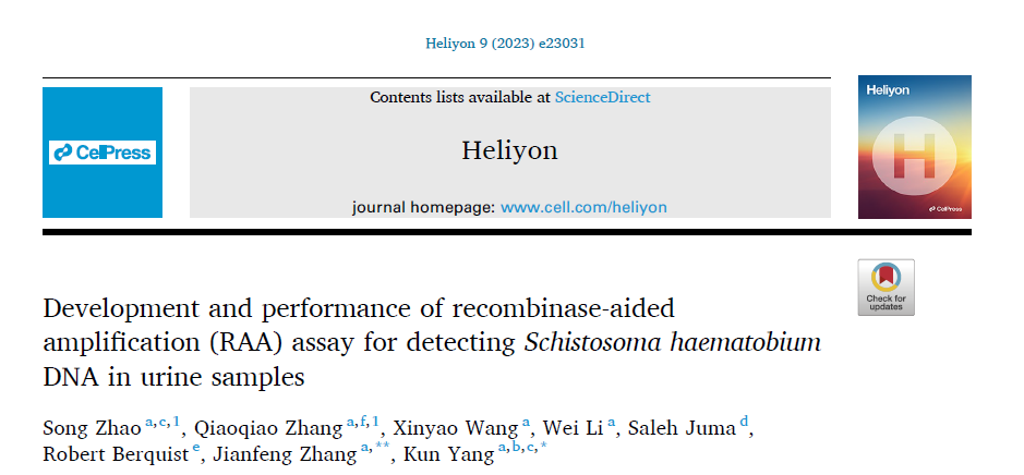 江苏省血吸虫病防治研究所赵松副研究员和硕士研究生张乔乔为本文第一作者,张键锋副主任技师和杨坤研究员为本文通讯作者。原文链接:https://doi.org/10.1016/j.heliyon.2023.e23031。