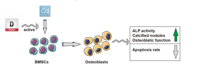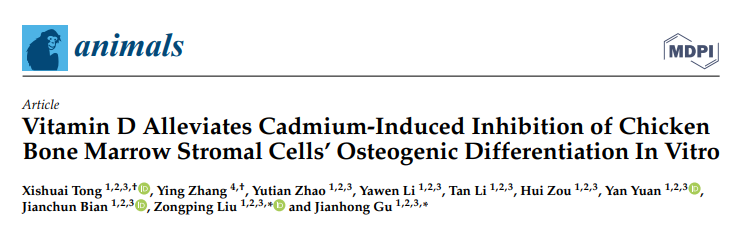 维生素D是一种脂溶性维生素,主要用于治疗骨代谢相关疾病,如骨质疏松症(OP)、骨质软化症(OM)、多发性骨硬化症(MS)和类风湿性关节炎(RA)。日粮中补充维生素D3和钙(Ca)可降低肉鸡胫骨软骨发育不良(TD)的严重程度和发生率。镉(Cd)是自然界中的一种重金属元素,具有骨毒性,包括破坏骨基质和损伤骨相关细胞(如骨髓基质干细胞和成骨细胞),甚至诱导骨相关细胞凋亡。近日,我所联合扬州大学兽医学院在《Animals》(IF= 3.231)发表研究性论文《Vitamin D Alleviates Cadmium?Induced Inhibition of Chicken Bone Marrow Stromal Cells’ Osteogenic Differentiation In Vitro》,探讨了体外Cd毒性对BMSCs成骨分化的影响以及lα,25?(OH)2D3的缓解作用。