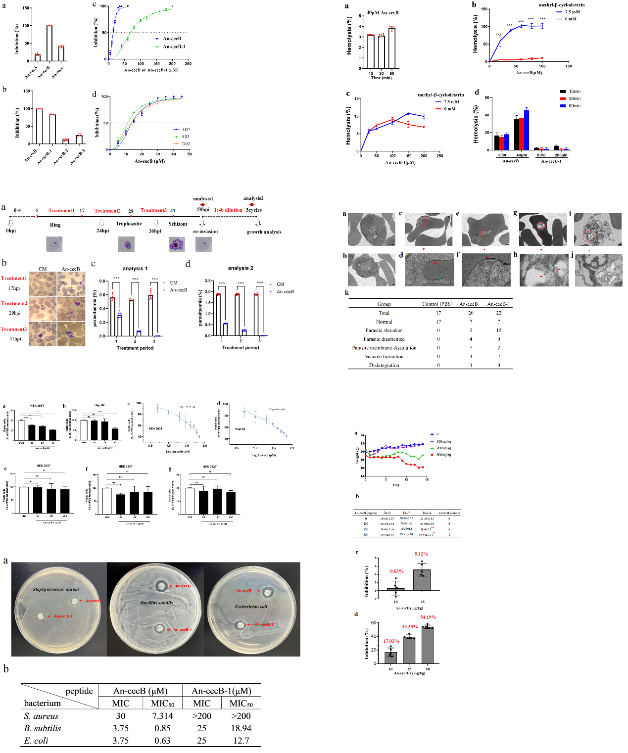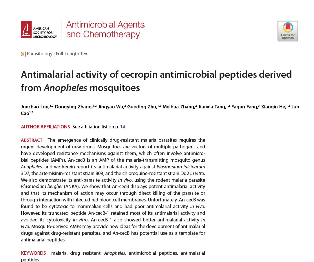 疟疾仍然是危害人类健康的重要公共卫生问题。疟原虫耐药性是阻碍疟疾防控进程的一大挑战。寻找新型抗疟药物具有重要的科学研究意义和临床需求。作为疟疾的传播媒介,按蚊体内进化出对抗疟原虫的防御体系。抗菌肽(AMPs)是这一防御体系的重要组成部分。本研究报道了按蚊体内天蚕素抗菌肽An-cecB对疟原虫体外和体内抗疟活性,并对作用机制做了初步探究。研究结果表明,An-cecB对恶性疟原虫敏感株和抗性株均具有较强的体外抗疟活性。其作用机制可能通过直接杀死疟原虫或通过与受感染的红细胞膜相互作用发生。同时也发现An- cecB对哺乳动物细胞具有细胞毒性,并且在体内的抗疟活性不显著。然而,其截短肽An-cecB-1在保留了大部分抗疟活性的同时避免了体外细胞毒性。An-cecB-1在体内表现出比An – cecB更强的抗疟活性。以上结果提示,蚊源AMPs为开发针对耐药疟原虫的抗疟药物提供新的思路,An-cecB具有作为抗疟肽模板的潜在用途。