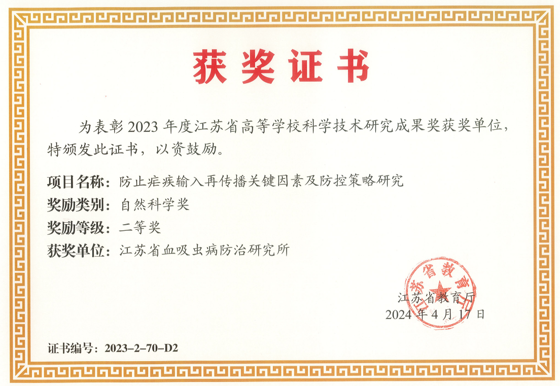近日获悉,由扬州大学和江苏省血吸虫病防治研究所共同完成的“防止疟疾输入再传播关键因素及防控策略研究”项目获得江苏省高等学校科学技术研究成果奖二等奖。