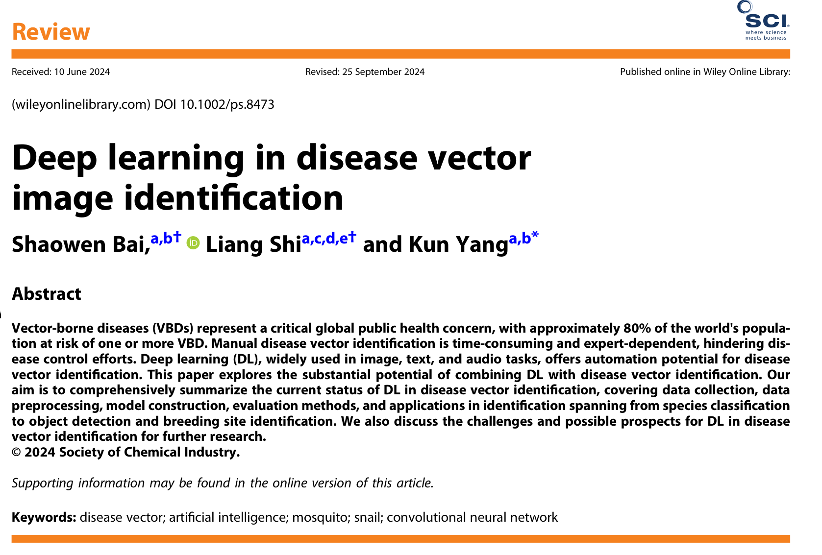 近日,我所研究团队在国际期刊《Pest Management Science》(IF=3.8/中科院1区)上发表了题为“Deep Learning in Disease Vector Image Identification”的综述论文,揭示了深度学习技术在病媒生物识别中的应用潜力,为未来的病媒控制技术提供了重要的参考。