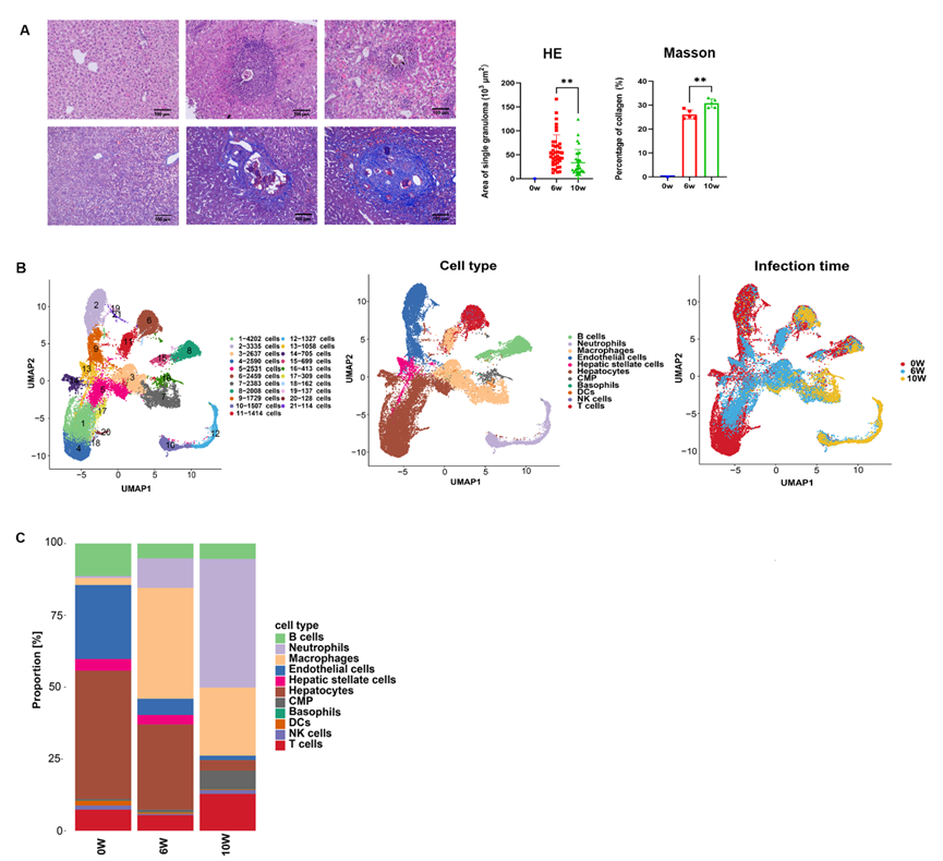 血吸虫病是一种严重危害人类健康的寄生虫病,主要包括急性期肝损伤和慢性期肝纤维化。然而,日本血吸虫感染过程中的致病机制仍不清楚。单细胞测序技术是一种在单个细胞水平上进行高通量测序分析的技术,它能够揭示细胞的异质性,即使是来自同一组织的细胞也可能在基因表达和基因组结构上存在差异。这项技术的发展对于理解细胞的功能、发育过程以及疾病机制具有重要意义,也为探索血吸虫病的发病机制提供了可能。