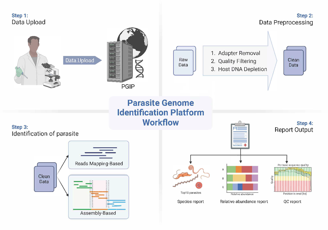 该研究开发了寄生虫基因组鉴定平台(Parasite Genome Identification Platform,PGIP)。该平台具有用户友好的图形化操作界面和标准化的自动分析流程,可实现对测序数据的快速分析。此外,针对现有其他平台的寄生虫参考基因组数据库质量参差不一的问题,研究还开发了专业的寄生虫参考基因组数据库,确保鉴定结果的准确性。