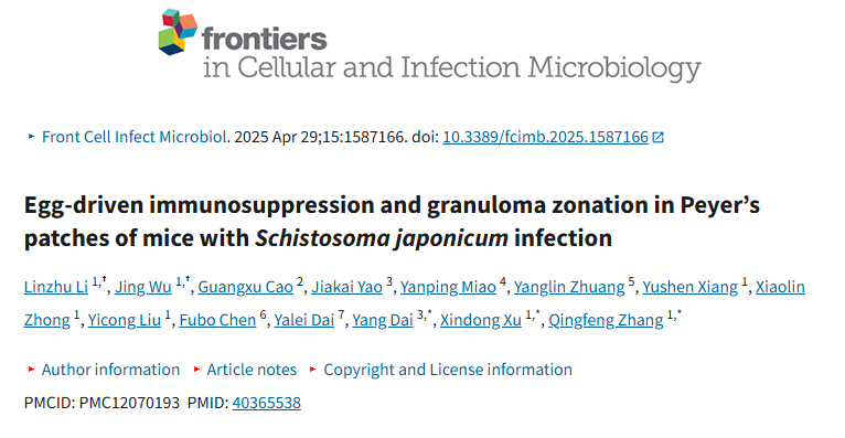 近日,同济大学医学院张青锋/江苏省血吸虫病防治研究所戴洋课题组合作在《Frontiers in Cellular and Infection Microbiology》上发表题为“Egg-driven immunosuppression and granuloma zonation in Peyer’s patches of mice with Schistosoma japonicum infection”的研究论著,首次系统揭示了日本血吸虫虫卵驱动派尔集合淋巴结免疫抑制和肉芽肿结构性分区的细胞与分子机制。