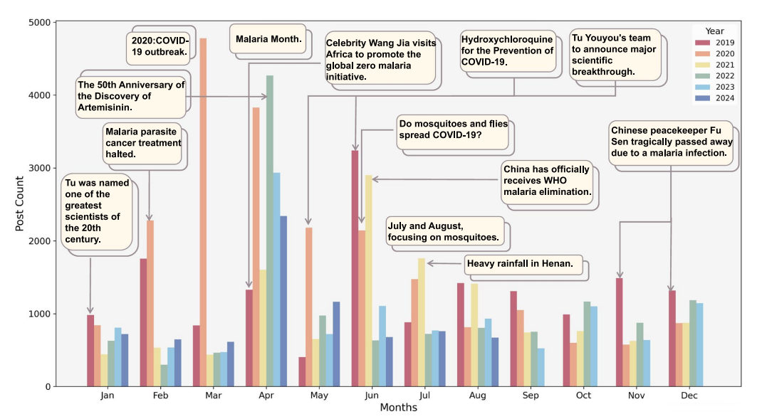 疟疾仍是全球主要公共卫生关切问题,尽管中国已获得世界卫生组织无疟疾认证,但近年来输入性病例持续出现,且公众对该疾病的认知和防范意识仍较为有限。微博作为中国极具影响力的社交媒体平台,积累了海量与疟疾相关的文本数据,为分析公众线上讨论模式和关注焦点提供了重要素材。随着输入性疟疾带来的潜在传播风险,以及公众健康知识普及的迫切需求,借助社交媒体数据挖掘了解公众对疟疾的核心关切与认知水平尤为重要。其中,基于社交媒体分析框架结合自然语言处理技术的研究方法,既能系统呈现疟疾相关话语的动态特征,又能精准捕捉不同群体的信息需求,是优化健康传播策略的可行技术路径。