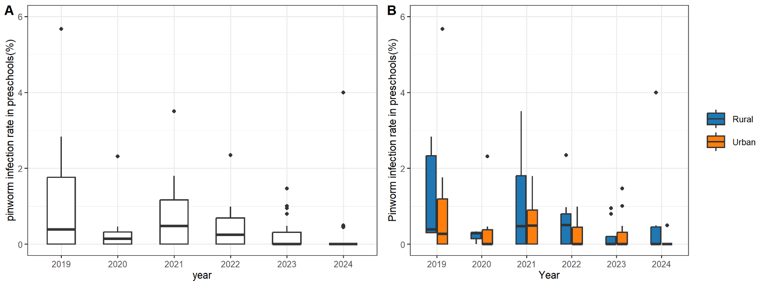 尽管我国寄生虫病感染率已大幅下降,蛲虫感染仍常见于学龄前儿童群体。但目前仍缺乏托幼机构层面的长期数据,学龄前儿童蛲虫感染的流行趋势、聚集性特征及危险因素一直缺少量化证据。