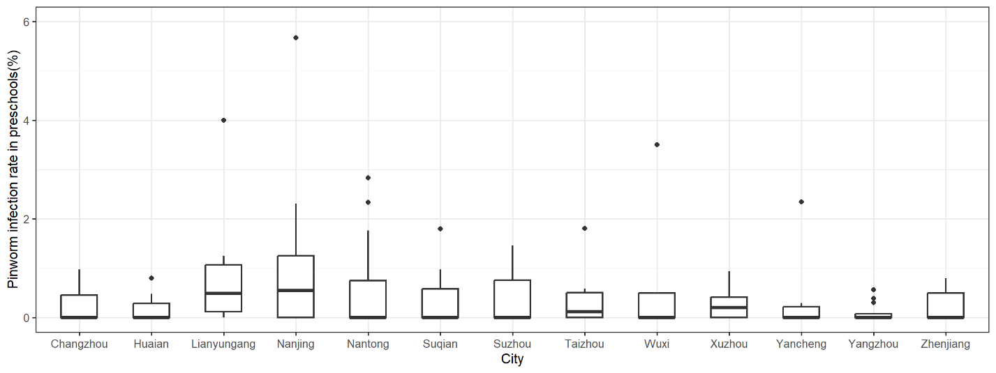 近日,江苏省血吸虫病防治研究所在国际知名期刊《PLOS Neglected Tropical Diseases》发表了题为“Understanding the trends, clustering, and risk factors of pinworm infection in preschool settings: A repeated cross-sectional multi-center study between 2019 and 2024”的研究性论著,对江苏省 45个 县(市、区)104 所幼儿园、近 2.8 万名 2–7 岁儿童开展的重复横断面调查。