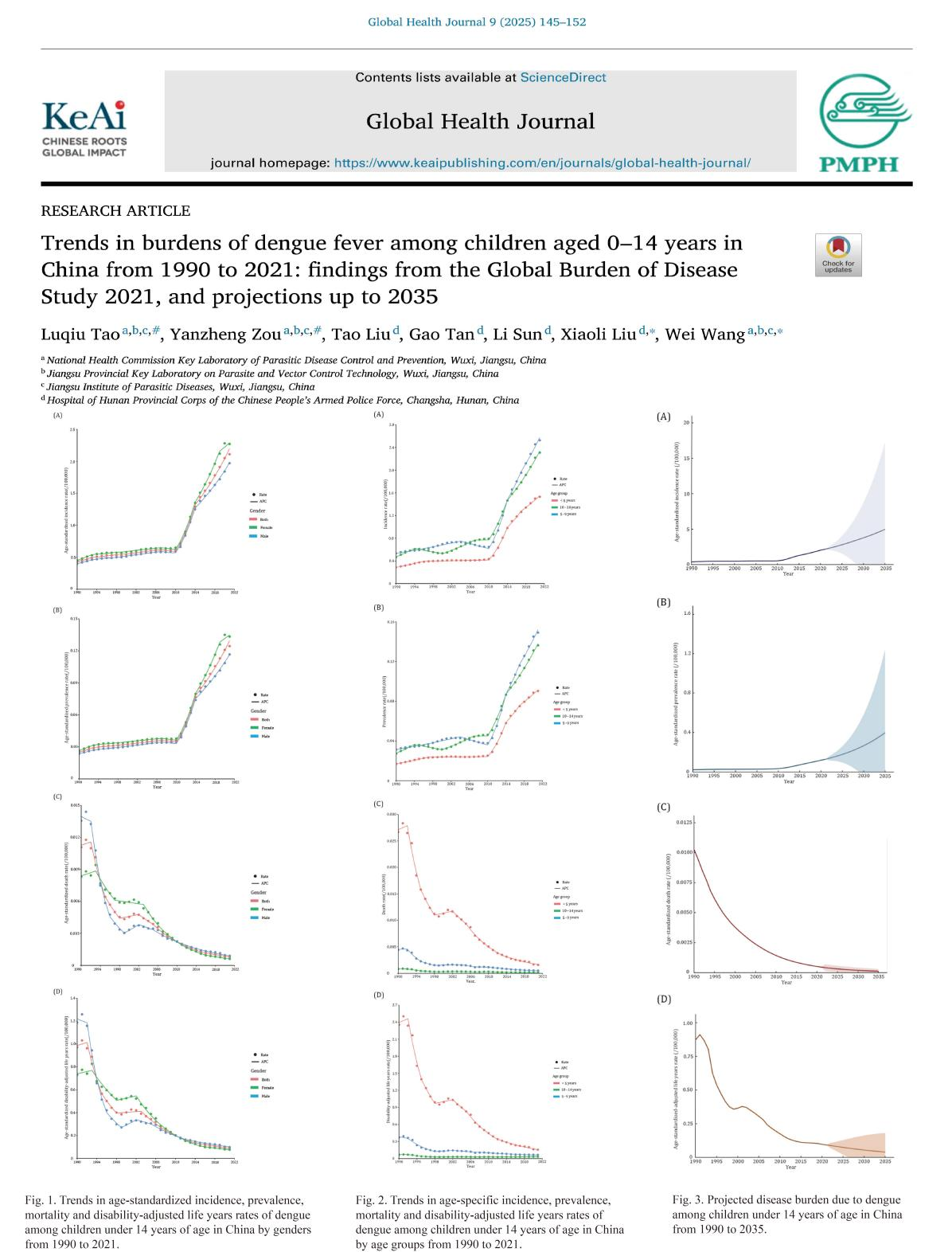 我所研究人员于卓越期刊《Global Health Journal》发表题为《Trends in burdens of dengue fever among children aged 0—14 years in China from 1990 to 2021: findings from the Global Burden of Disease Study 2021, and projections up to 2035》的研究性论文,系统评估了1990—2021年我国0—14岁儿童登革热疾病负担,并预测其至2035年的变化趋势,为制定有针对性的防控策略提供了科学依据。