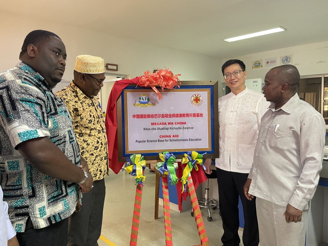 2024年4月9日,首个中国援助坦桑尼亚桑给巴尔血吸虫病健康教育科普基地揭牌仪式在桑给巴尔奔巴岛举行,中国驻桑给巴尔代总领事张明、奔巴岛地区行政长官哈马德·萨利赫、查克查克区长拉什德·阿里、奔巴岛卫生署长比拉里·阿里等官员和专家出席揭幕仪式。