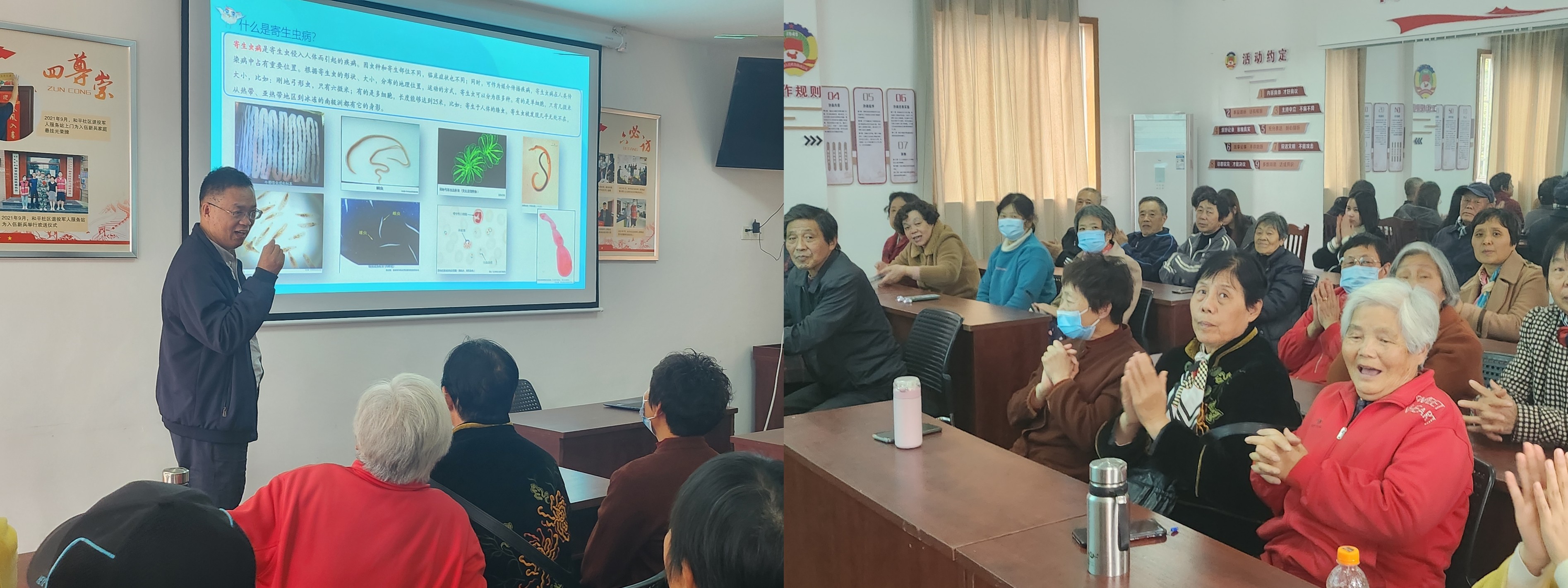 省血防研究所杨坤副所长给社区群众作了“寄生虫离我们有多远”为主题的知识讲座,为社区群众科普了常见寄生虫病预防的相关知识。杨坤副所长利用生动的图片,诙谐易懂的语言向村民们详细介绍了寄生虫的基本知识,介绍了我国三大重要的寄生虫病包括血吸虫病、疟疾、包虫病的流行及预防的知识。此外,还介绍了生活中存在风险的寄生虫病如蛲虫病、肝吸虫病、弓形虫病等预防知识。